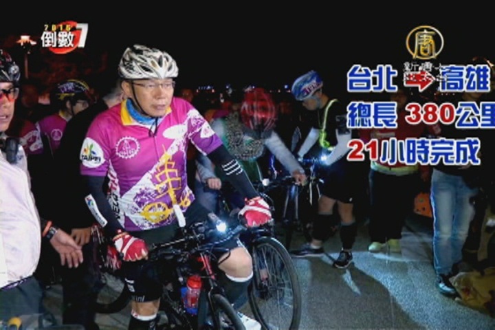 【新唐人亞太台 2016 年 01 月 09 日訊】繼續看到,選前黃金週,台北市長柯文哲,再度挑戰體能極限,清晨從關渡出發,騎單車一路往南,預計要在21小時內,完成台北-高雄380公里路程。