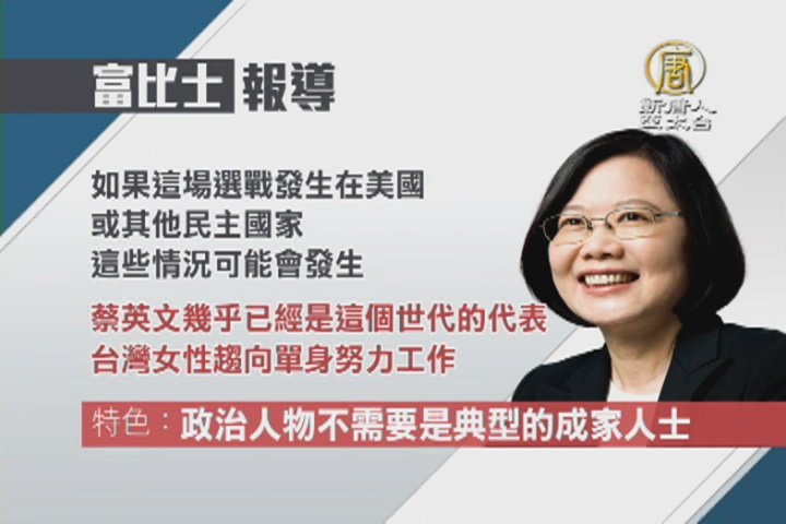 民進黨總統候選人蔡英文,身為女性,並且沒有結婚,受到外媒關注。《富比士》報導,「2012年總統大選,蔡英文身為女性,是否有辦法引領軍隊受到議論,但今年沒有重要人物炒作她的女性身分,或是婚姻狀況。如果這場選戰發生在美國或其他民主國家,這些情況可能會發生。」報導也說,「蔡英文幾乎已經是這個世代的代表」,「台灣女性趨向單身,努力工作」。