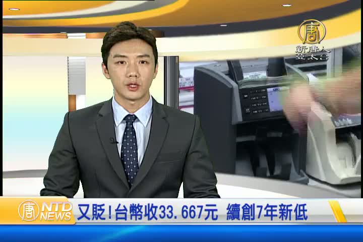 【新唐人亞太台 2016 年 01 月 13 日訊】鏡頭轉回台灣,台北股、匯市昨天又同步收黑,新台幣兌美元終場收在33.667元 貶值1.6分,不僅連兩個交易日收貶,更續創近7年收盤新低價。