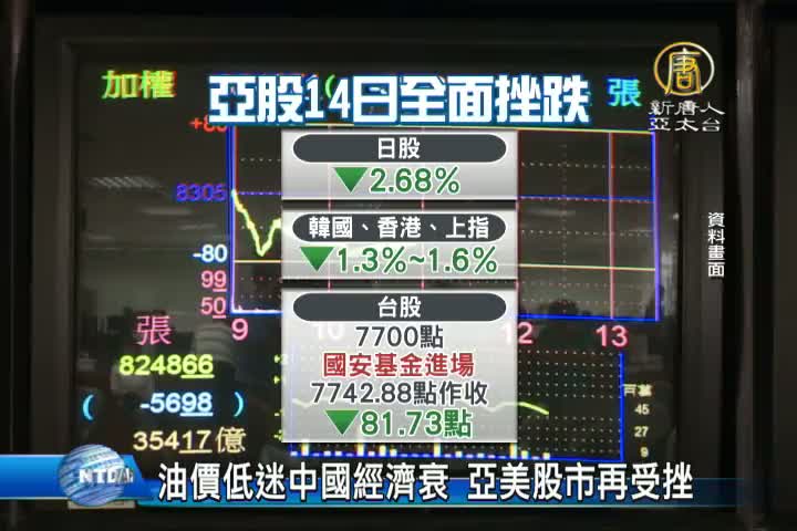 【新唐人亞太台 2016 年 01 月 14 日訊】今天全球股災蔓延,美股疲軟,亞股再受驚嚇,中國股市今天更跌掉25%,逼近去年低點 ,台股早上一度失守7700大關,所幸隨後國安基金進場拉抬,跌幅收斂,7700點失而復得。