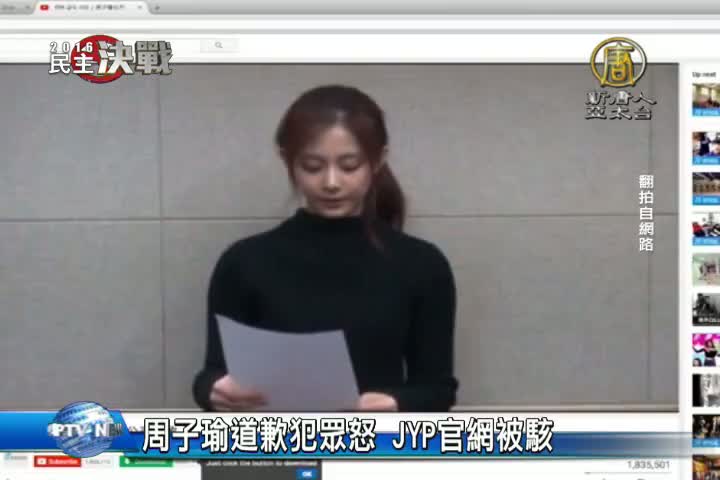【新唐人亞太台 2016 年 01 月 16 日訊】好,選戰之夜,除了各陣營選票起伏之外,周子瑜,絕對是今天新聞的關鍵字,來看到,莫名被黃安點名為「台獨分子」的藝人周子瑜,在昨天晚間公開道歉,引發台灣輿論群情激憤。國台辦,今天中午發聲明急滅火。周子瑜經紀公司JYP的官網,則是在下午,被駭客入侵,全面癱瘓。