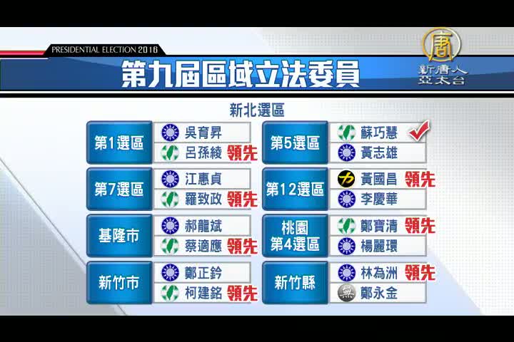 【新唐人亞太台 2016 年 01 月 16 日訊】歡迎回到新唐人選戰之夜新聞現場。來看到,立委開票的最新情況,新北市第一選區民進黨呂孫綾領先國民黨吳育昇,新北市第五選區民進黨蘇巧慧領先國民黨黃志雄,新北市第七選區 民進黨羅致政領先國民黨江惠貞新北市第十二選區,時代力量黃國昌以3萬4,458票領先國民黨李慶華的3萬409票。基隆市選情,民進黨蔡適應領先國民黨郝龍斌,而桃園第4選區民進黨鄭寶清領先國民黨楊麗環,新竹市民進黨柯建銘領先國民黨鄭正鈐。新竹縣國民黨林為洲領先無黨籍鄭永金。而蘇巧慧已經在剛剛自行宣布當選。