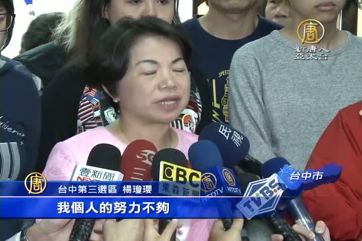 【新唐人亞太台 2016 年 01 月 16 日訊】台中第三選區,國民黨楊瓊瓔與時代力量洪慈庸相差一萬多票,稍早,瓊瓔已經出面發表落選感言。