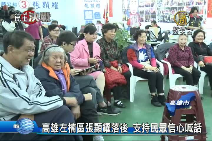 【新唐人亞太台 2016 年 01 月 16 日訊】高雄市第三選區劉世芳一路,稍為落後的張顯耀競選總部支持民眾,也在現場信心喊話,帶您看到張顯耀競選總部情況。