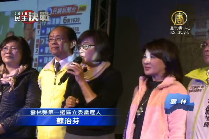 【新唐人亞太台 2016 年 01 月 16 日訊】雲林縣第一選區,代表民進黨參選的前縣長蘇治芬,開票後,一路領先,成功為綠營拿下海線版圖,在對手張鎔麒自行宣布敗選後,蘇治芬也來到競選總部,發表當選感言。