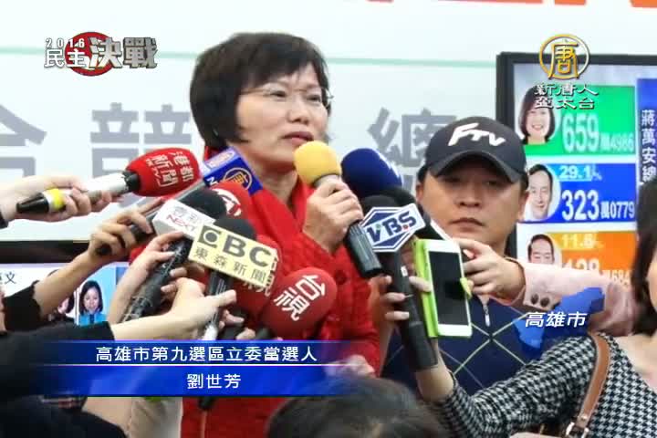 【新唐人亞太台 2016 年 01 月 16 日訊】再來看到高雄立委選情,在第3選區,民進黨新人劉世芳挑戰成功,贏過國民黨張顯耀2萬多票,國民黨目前在高雄九席,是全軍覆沒。