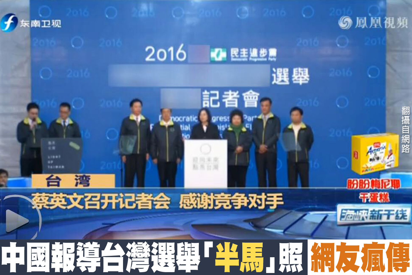 2016-01-18 20:22:45台灣大選,中國媒體也報導,不過,卻在影像上動了手腳,有網友拍下截圖,中國報導蔡英文勝選的國際記者會,版面上的中華民國、總統、還有國際這些文字,以及國旗,都被馬賽克處理,只剩下民進黨旗。有網友轉貼就說,馬成這樣乾脆不要報,不是更好?還有留言,越碼越讓人想知道,被碼掉了什麼。