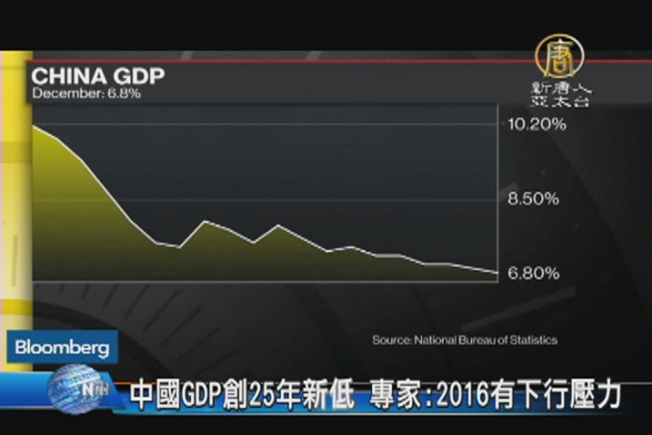 【新唐人亞太台 2016 年 01 月 19 日訊】中國政府今天公布2015年第四季GDP,比上一個季度下跌0.1%,來到為6.8%。同時也公布2015年年度GDP,為6.9%,創下25年新低。