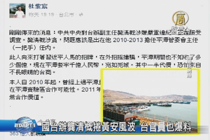 【新唐人亞太台 2016 年 01 月 20 日訊】台灣大選後 3天(19日),中共國台辦副主任龔清概 因為涉嫌「嚴重違紀」被調查。有消息指稱,黃安事件後,龔清概遭舉報,以「反臺獨」為藉口,要脅台灣知名女藝人與其有染;另外,工研院知識競爭力中心主任杜紫宸也爆料,龔清概在任期間,「不知收了多少個億」。