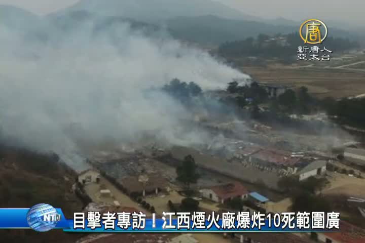 【新唐人亞太台 2016 年 01 月 20 日訊】1月20號凌晨,江西上饒市昆山村一間煙火工廠發生大爆炸,至少10人死亡,方圓約九公里的民房玻璃都被震碎,村民連夜逃生;新唐人記者採訪了目擊者,他們表示,附近村莊有很多家煙火廠,因為政府監管不力,以前也發生過多起爆炸死亡事故。