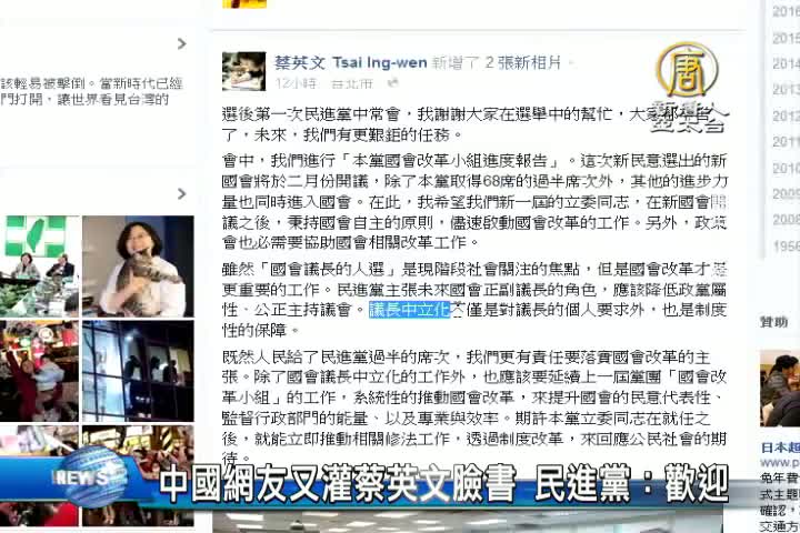 【新唐人亞太台 2016 年 01 月 21 日訊】民進黨總統當選人蔡英文的臉書昨天又被中國網民洗版,晚間一則「國會議長中立化」的臉書貼文,在3小時內湧入2萬多則貼文,很多留言都是簡體字,貼文指「反台獨」。對於蔡英文臉書又遭洗版,民進黨簡短回應「歡迎光臨民主自由的台灣」,並表示「不會刪文」。