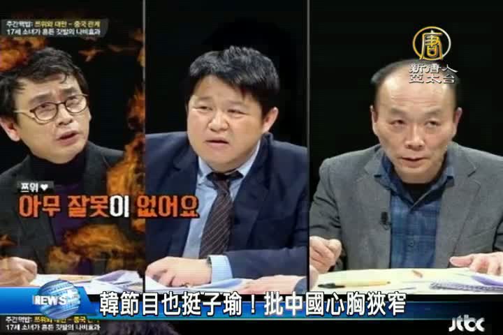 【新唐人亞太台 2016 年 01 月 23 日訊】周子瑜道歉風波,不但在台灣引起民眾憤慨,連韓國人也表示,看不下去。韓國JTBC電視台評論節目《舌戰》,作家劉時玟說,周子瑜什麼錯都沒有,中國土地遼闊但心胸狹窄。律師金元冊也說,搖晃自己國家的國旗很正常,他呼籲音樂就是音樂,不該什麼都和政治聯在一起。