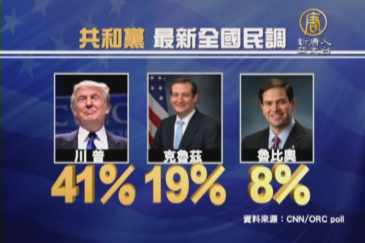 根據CNN日前公布的最新全國民調,目前川普在共和黨內仍以41%的支持度遙遙領先,克魯茲則以19%排名第二,魯比奧以8%排在第三位。
