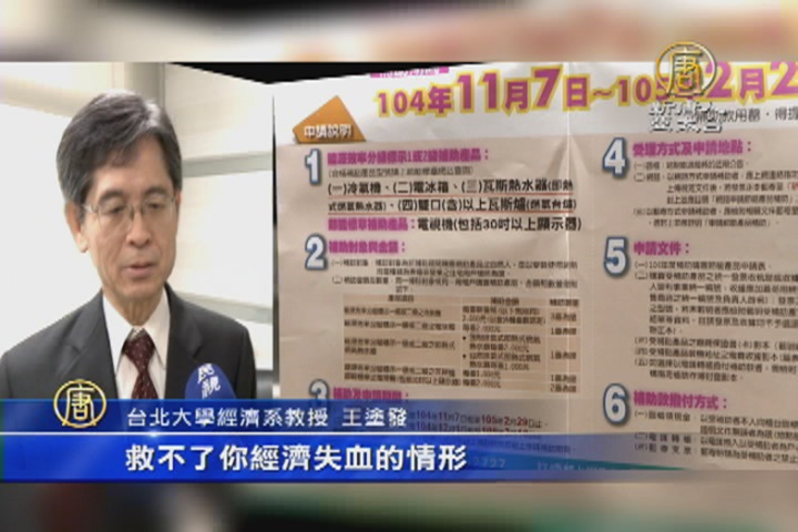 台北大學經濟系教授 王塗發:「光靠一個節能減碳的補助措施,那個東西比起來,等於是杯水車薪,救不了你經濟失血的情形。我們出口衰退,然後你影響國內企業的成長,實質薪資不漲,又影響到民間消費嘛。」