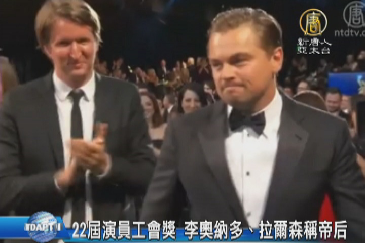 【新唐人亞太台 2016 年 02 月 01 日訊】被視為奧斯卡風向球的美國演員工會獎昨天揭曉,剛拿下金球獎最佳男、女主角的李奧納多和布麗拉爾森,分別藉著《神鬼獵人》和《不存在的房間》,再贏得影帝和影后,距離奧斯卡小金人越來越近。