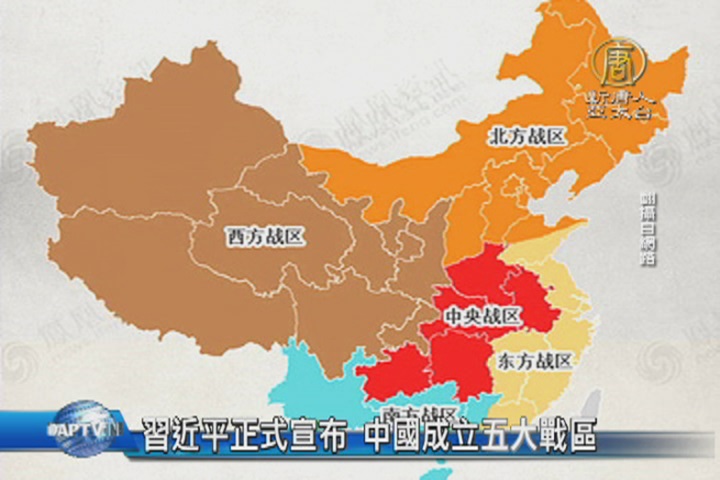 【新唐人亞太台 2016 年 02 月 01 日訊】中國軍事又有重大改革。來看到,中國國家主席習近平,今天向五大戰區授予軍旗,同時發布訓令,宣布建立東部戰區、南部戰區、西部戰區、北部戰區和中部戰區。《南華早報》,在去年12月8日的時候,引述親軍方消息人士的說法表示,中共軍隊預計在12月底,完成指揮體系的全面改革,過去的七大軍區將會被解散,取而代之的,就是「五大戰區」。這是否是新一輪的習江鬥爭較勁,後續發展,請密切鎖定新唐人報導。