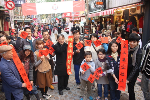 百人寫春鬧中平-民眾與貴賓大合照,展示各自的獨家創意春聯(力譔堂提供)
