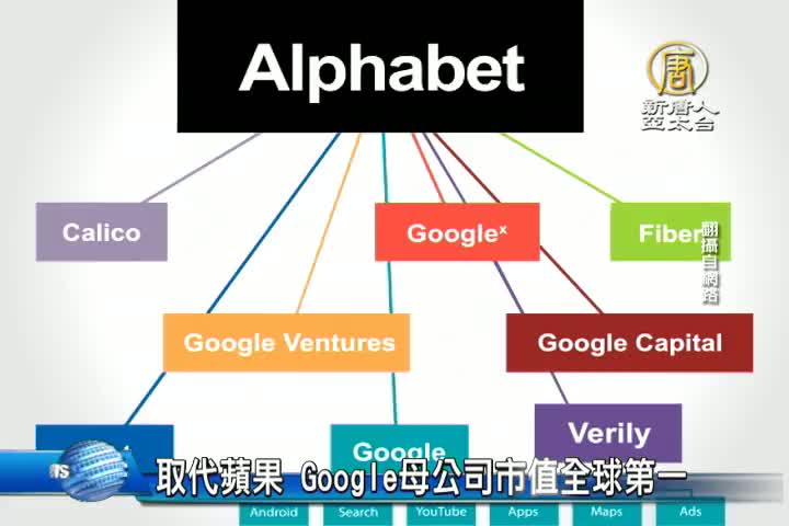 【新唐人亞太台 2016 年 02 月 02 日訊】數位廣告市場興起,加上智慧型手機需求放緩, Google的母公司Alphabet發布第四季財報,擠下蘋果,成為全球市值最高的企業。去年,谷歌對公司架構進行重大重組,新設立 控股母公司 Alphabet,谷歌和各種創新研發項目,成為並列的全資子公司,週一財報首次公布「射月計畫」及其他非核心事業的營收表現,成長驚人,第四季度營收約為210億美元,總市值已超過目前市值正在下滑的蘋果公司。