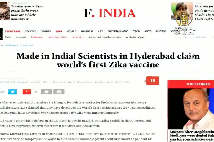 【新唐人亞太台 2016 年 02 月 04 日訊】茲卡病毒疫情已蔓延至全球30國,印度一間實驗室的科學家3號宣稱,已經研發出全球第一個對抗茲卡病毒疫苗,並已申請專利。只要通過審核,4個月可生產100萬劑茲卡病毒疫苗。