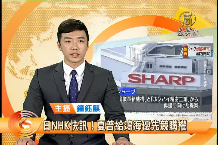 【新唐人亞太台 2016 年 02 月 04 日訊】午報頭條,先帶您看到,日本NHK中午以快訊報導,日商夏普,本來將由日本官方及民間基金接手經營,但今天召開董事會,確定由台灣的鴻海集團以超過6千億日圓的高價收購金額,奪下夏普公司經營權。夏普在董事會中決議,將給予台灣鴻海集團優先購買權,並藉由台灣資金重新再造夏普。外界關注多時的鴻夏戀,這下終於開花結果。