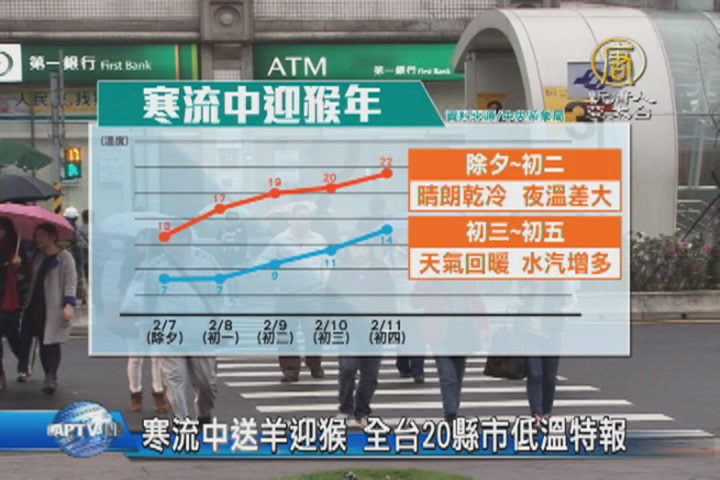 【新唐人亞太台 2016 年 02 月 04 日訊】新聞頭條帶您關心,明天新一波寒流報到,氣象局再下修過年低溫預測,從週六小年夜到大年初二,受寒流及輻射冷卻影響,全台氣溫都會明顯偏低,中部以北,最低溫將下探6度,氣象局也已經針對20個縣市發出低溫特報。