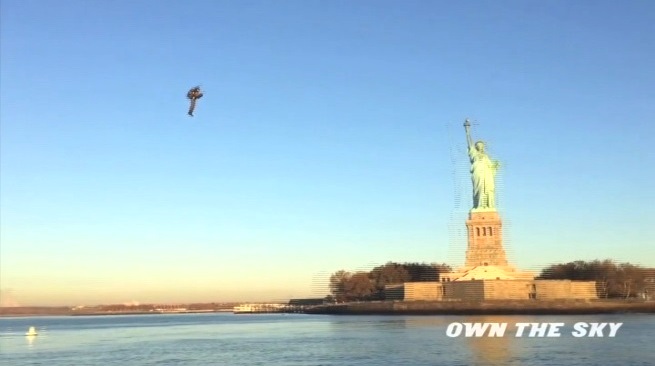 啟動按鈕,隨著巨大的引擎聲響,揹著飛行背包的飛行員馬上脫離地心引力的束縛,在空中來一個小轉彎,然後橫跨遼闊的哈德遜河,甚至達到了紐約著名地標自由女神像的高度。