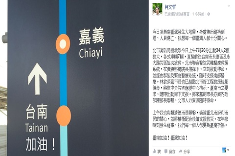 6日凌晨規模6.4強震,台南多棟大樓倒塌,台北市消防局搜救隊今日上午7時20分出動34人2搜救犬,各式車輛7輛,直接前往台南市永康區及永大路災區協助搶救。市長柯文哲在臉書po文表示關心,「我想每一個臺灣人都十分關心。在年節時刻發生這事,我們每一個人都要為臺南祈福。」柯文哲表示,上午已與台南市長賴清德聯繫,表達台北市府的關心,以及隨時可以支援。柯文哲在文章結尾寫上「臺南加油!臺灣加油!」並貼一張高鐵車站圖,在台南站旁寫上「加油」。