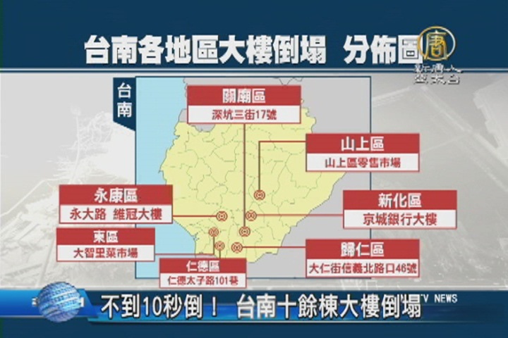 【新唐人亞太台 2016 年 02 月 06 日訊】首先來帶您看一下這次受災最嚴重的台南。來看到台南各地區大樓倒塌的分佈圖。首先是新化區,京城銀行大樓倒塌,所幸沒有人員受傷。再來是,永康區,永大路,維冠大樓倒塌,目前是災情最嚴重的大樓。東區,大智里菜市場,有大樓倒塌,仁德區,歸仁區,山上區,關廟區,都有大樓倒塌。這些大樓,所幸都只有人員受傷,沒有人死亡。