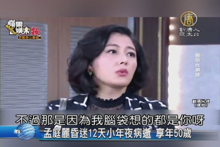 【新唐人亞太台 2016 年 02 月 06 日訊】女星孟庭麗上個月26日,在拍戲途中,突然休克昏迷,孟庭麗的經紀人稍早之前證實,在昏迷12天後,孟庭麗今天下午,病逝台北榮總,享年50歲。孟庭麗的家屬明天上午10點,將在台北榮總舉行器捐記者會,預料到時會對外進一步說明。