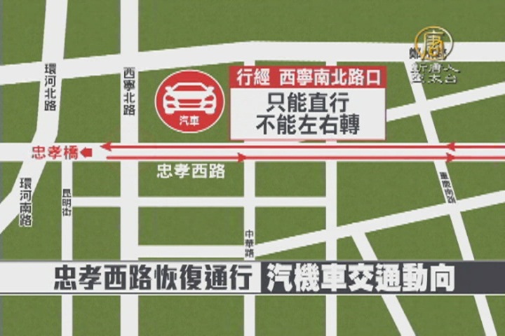 客運、巴士恢復行駛,路線通通不變,進出台北市從原本的4車道改為3車道,為了解緩市區車流量,汽車經過西寧南北路口,只能直行不能左右轉,機車下橋後,可以在忠孝西路二段16巷回轉,再從西寧北路進到鄭州路,或是從洛陽街穿過中華路,直接上到延平北路。不過進出城道路減少,車況是否受到影響。