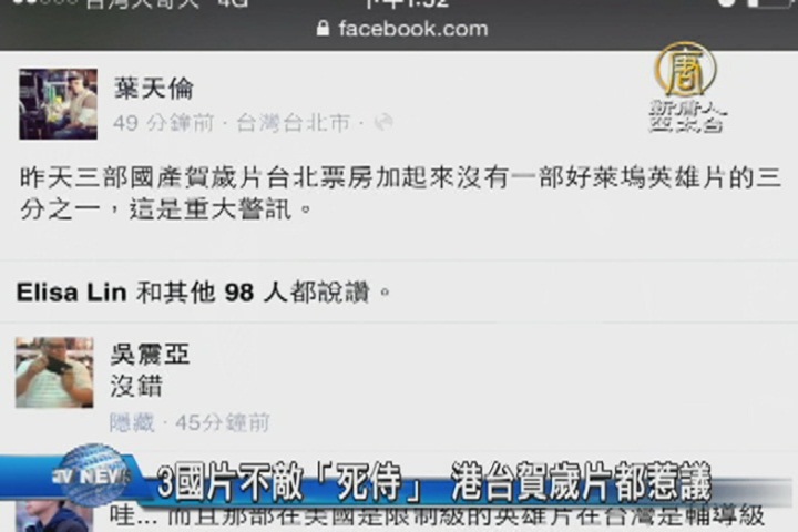 【新唐人亞太台 2016 年 02 月 13 日訊】港台都關注的賀歲片檔期,好萊塢電影「死侍」一上映就開出紅盤,也讓台灣導演憂心國片未來。除了票房引發網友討論,由豬哥亮主演的電影《大尾鱸鰻2》,遭網友質疑歧視原住民,而香港導演王晶的《澳門風雲3》,觀眾認為劇情老梗,甚至發起罷看運動。