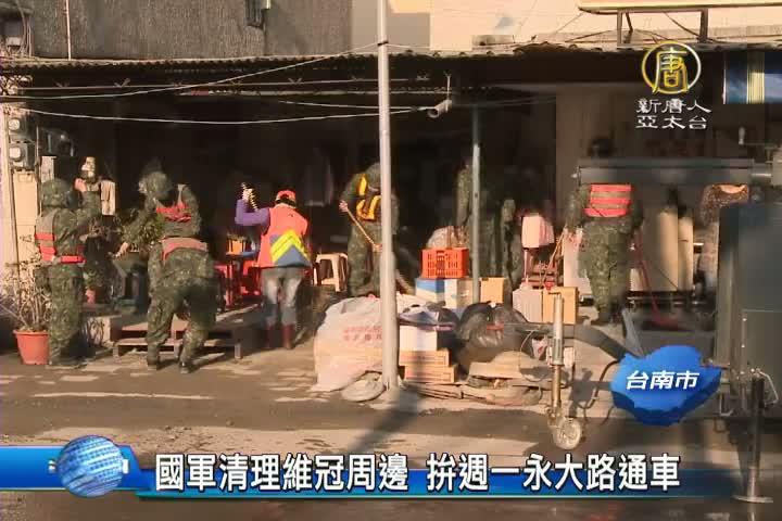 【新唐人亞太台 2016 年 02 月 14 日訊】歷經180小時搜救行動告一段落,明天就是週一上班日,國軍化學兵從昨晚開始連夜在台南維冠大樓周邊進行災區消毒作業, 也加強清理路面,希望明天,能順利恢復永大路通車。