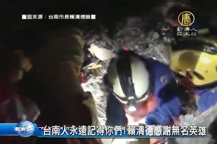 【新唐人亞太台 2016 年 02 月 14 日訊】南台灣強震,歷經180小時馬拉松全力搜救,13日尋獲最後一名罹難者,台南市長賴清德宣布搜救作業結束,也特別在臉書PO出影片,向救難英雄表達謝意,賴清德說,台南市民永遠感謝他們。