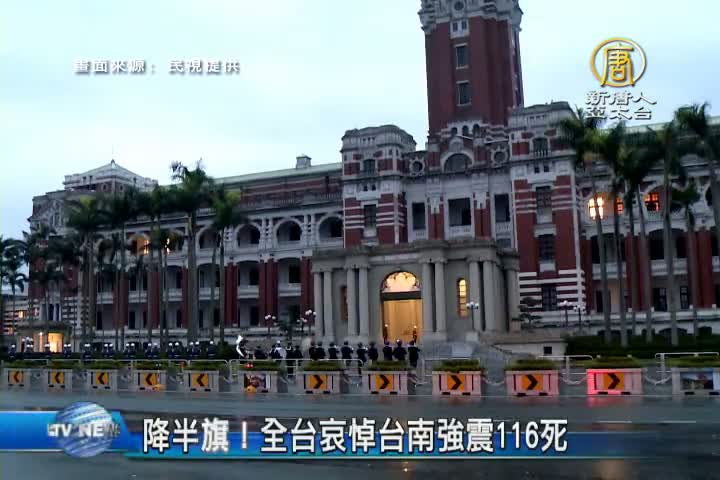 【新唐人亞太台 2016 年 02 月 15 日訊】小年夜強震,為台南帶來嚴重災情,116人葬身瓦礫堆下。過年連假結束,開工第一天,全國機關、學校,降半旗一天,為2月6日地震罹難者,表達最沉痛的悼念。另外,包括總統府、行政院、以及各地縣市政府,原訂的新春團拜活動,也一併取消。