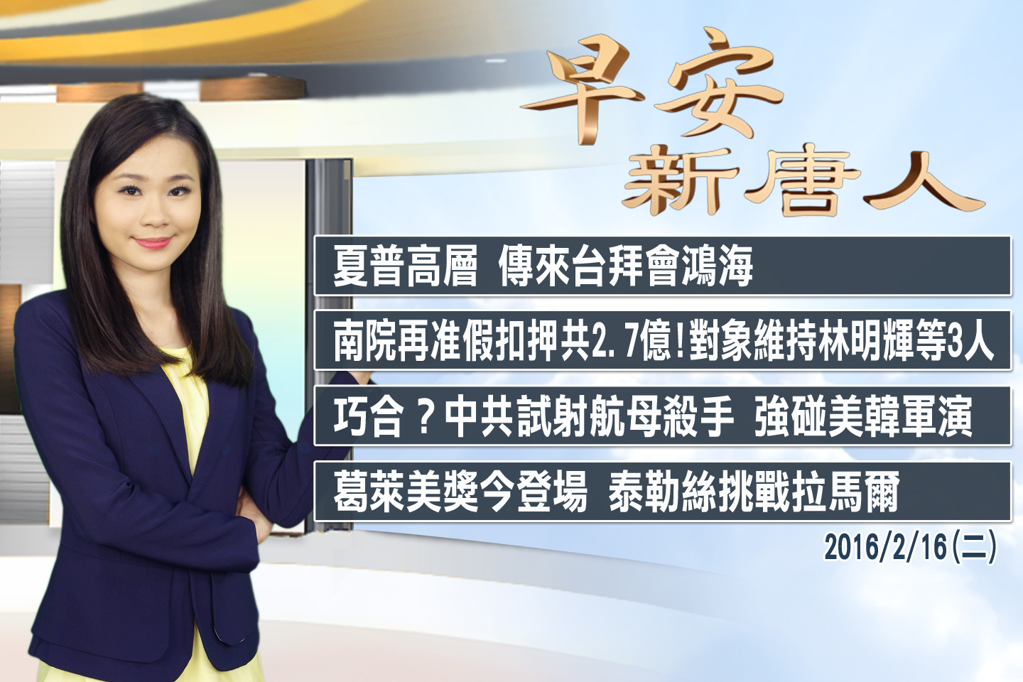 2016-02-16 13:38:47二月16日,星期二,新唐人午間新聞,30分鐘,帶您看見全世界。