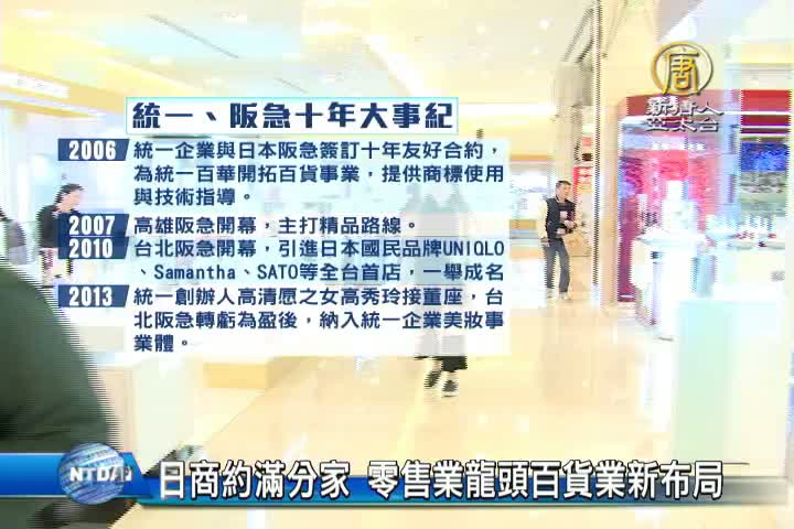 【新唐人亞太台 2016 年 02 月 17 日訊】統一集團與日本阪急阪神百貨的10年合作即將結束,統一阪急百貨也將更名為「統一時代百貨」,成為統一集團百分之百獨資經營的百貨公司。