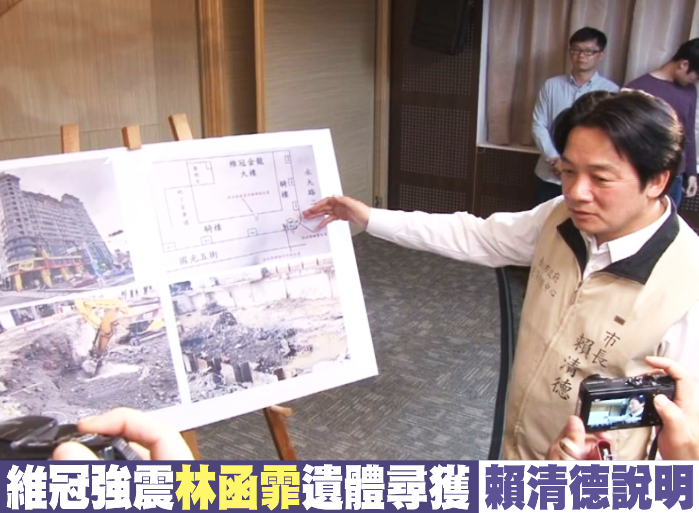 【新唐人亞太台 2016 年 02 月 18 日訊】維冠大樓倒塌案搜救工作結束後,被列為失蹤人口的附近住戶林函霏,警方連日搜尋後,今天在開挖的維冠大樓地下室找到遺體,來看到,市長賴清德稍早的記者會。