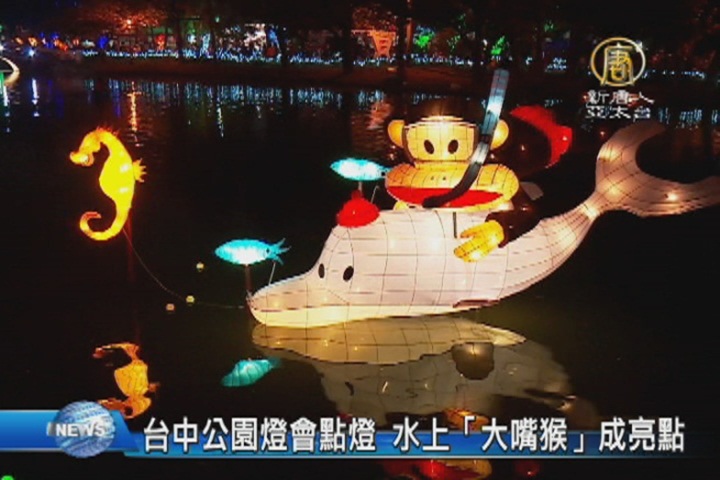 除了主燈外,台中公園湖面上,還有潛水造型的大嘴猴,就像真的在游泳,搭配水舞,美麗的光影變化吸引民眾前往搶鮮拍照,為期13天的展期,要將卡通與傳統燈會結合,給民眾全新體驗。