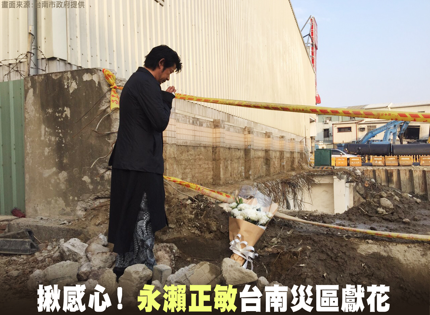 【新唐人亞太台 2016 年 02 月 19 日訊】電影《KANO》中的靈魂人物,飾演棒球教練的日本男星永瀨正敏,今天來台,接受觀光局頒發「台灣觀光貢獻獎」。下午,永瀨正敏前往台南地震災區,維冠大樓倒塌地點獻花致哀。然後又到台南首廟 天壇,為地震災民祈福。永瀨正敏說,日本311大地震後,台灣對日本支持的感動還在,他想要把這份感動也帶給台灣人。