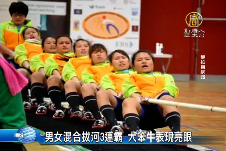 【新唐人亞太台 2016 年 02 月 22 日訊】來看到世界盃室內拔河錦標賽,中華隊又有捷報,在男女混合600公斤級,擊敗中國大陸,贏得金牌,寫下三連霸,也一吐女子500公斤級挫敗的悶氣;另外,由南投高中、大葉大學等各界組成的「大笨牛夢想拔河隊」,受到樂團五月天及民眾大力贊助經費出國比賽,目前共拿下 4金2銀,是中華拔河隊男子組歷年最優成績。