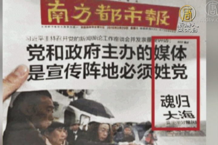 【新唐人亞太台 2016 年 02 月 22 日訊】2月20號,中國幾乎所有媒體都以「媒體必須姓黨」為頭條,廣東的《南方都市報》深圳版,雖然頭條大標題也是,但是卻在標題之下,配以蛇口招商局創辦人袁庚的骨灰撒入海港的照片,並加上了「魂歸大海」四個大字,而這四個字又剛好與上方標題的尾部整齊對列,使版面呈現出「媒體姓黨 魂歸大海」的視覺效果,引起中國網友議論。