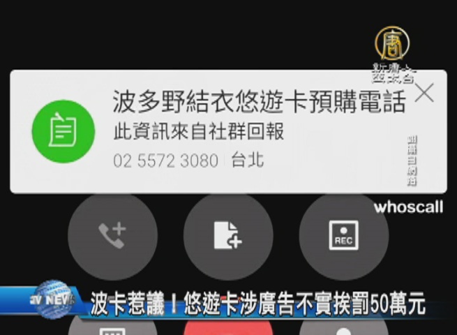 【新唐人亞太台 2016 年 02 月 24 日訊】好,曾讓柯文哲飽受困擾的悠遊卡「波卡風波」,公平會介入調查後,今天宣布,悠遊卡公司,涉及廣告不實。公平會說,悠遊卡刊登廣告,開放電話預購 波多野 悠遊卡,但又將訂購數量灌水,涉及廣告不實,決定處 悠遊卡公司50萬元罰鍰。