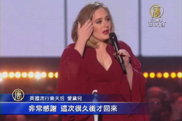 【新唐人亞太台 2016 年 02 月 25 日訊】英國天后創作歌手愛黛兒今天在全英音樂獎頒獎典禮,一舉拿下最佳英國女歌手、最佳英國年度專輯、英國最佳單曲、及海外最成功歌手4項大獎,氣勢驚人,是最大贏家。