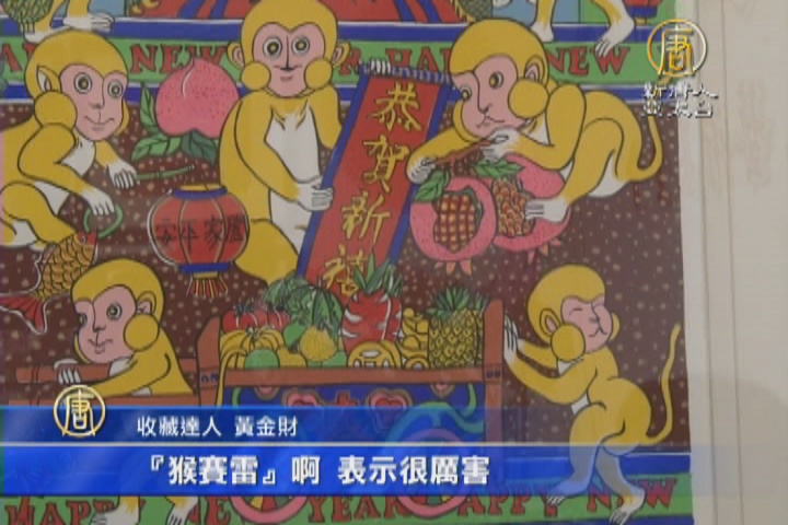 收藏達人 黃金財:「拿了27幅來這邊展,大部分都是一些跟12生肖有關,特別是今年是猴年,猴賽雷啊!表示很厲害,我們常常說馬上封侯或者說鴻福齊天。它看起來比較喜氣洋洋,色彩又很繽紛,琳瑯滿目、美不勝收!」