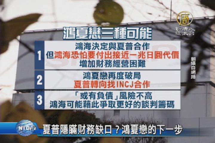 【新唐人亞太台 2016 年 02 月 26 日訊】鴻夏戀再起波瀾,關鍵就是夏普有高達3500億日圓的或有負債,讓鴻海方面緊急喊剎車,外界分析,鴻夏戀後續,有三種可能走向,鴻海董事長郭台銘也可能藉此,在談判上獲得更多的斡旋空間。