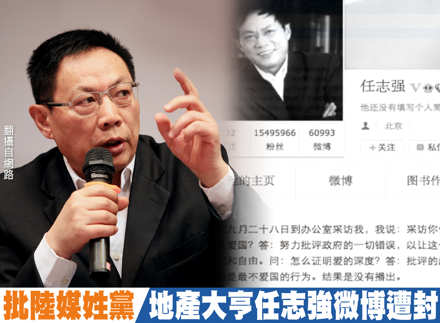 【新唐人亞太台 2016 年 02 月 29 日訊】中國大陸境內至今仍無法用臉書,超過五億的網友都使用「微博」;然而,在中國有3,700萬粉絲的地產大亨,任志強。最近,帳號卻遭關閉,任志強近來,陸續發微博對抗中共體制,也抨擊中國官媒姓黨,無法為公眾服務,然而之後卻遭中共官媒大規模圍剿,微博帳號也被關閉,目前無法被搜尋,任志強截至目前已發了9萬篇微博,其中也在網路上,引發了中共不等於中國的相關討論。