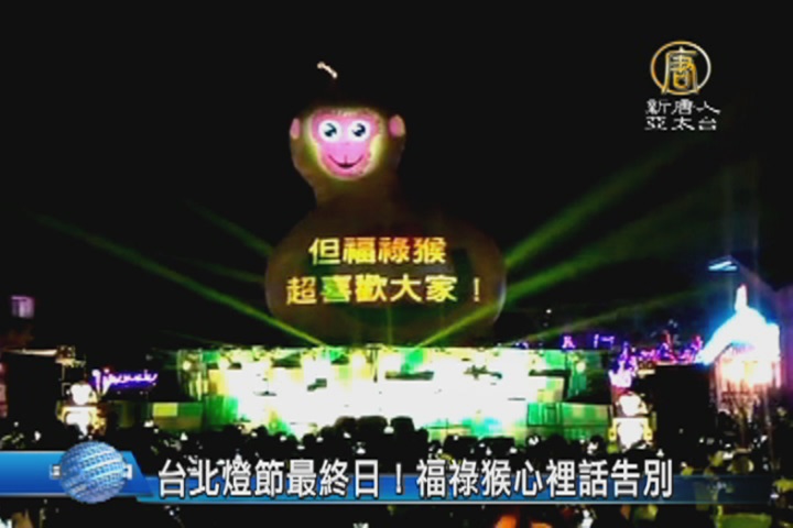 【新唐人亞太台 2016 年 02 月 29 日訊】台北燈節,今天晚間九點,即將閉幕,引起爭議的福祿猴,加碼說心裡話,馬上來看到,燈會最後一天現場的情況。 2016台北燈節將在今天晚上9點閉幕,主燈「福祿猴」 的光雕,將不再自我調侃「長得醜」,而是要用正面能量感性告別!那麼燈會結束後,福祿猴,則是將移到基隆港東側碼頭廣場,繼續展出。
