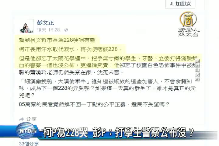 【新唐人亞太台 2016 年 02 月 29 日訊】昨天二二八,台北市長柯文哲在屏東鵝鑾鼻燈塔下發言時,忍不住哽咽,盼用「汗水取代淚水」,提出「寬容如海、成就台灣」。《正晶限時批》主持人彭文正,在臉書上發文表示:看到柯文哲市長為228哽咽有感,柯市長用汗水取代淚水,再次哽咽談228。但是他卻忘了太陽花學運中,把手無寸鐵的學生、牙醫、立委打得滿臉鮮血的警察一個也沒公布,更遑論究責;他卻忘了校園白色恐怖事件中被解職的蕭曉玲老師仍然失業在家,沈冤未雪。有網友回應:失去正義,將再度失去位置。