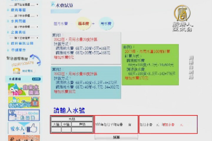【新唐人亞太台 2016 年 03 月 01 日訊】台北市水費將從今天三月一號開始調漲,台北市自來水事業處表示,大台北地區共152萬用水戶,調整後的水費,每度平均單價為新台幣11.56元,漲幅為28.16%,但其中大約6成用戶,因用水量少,將不受影響。其他用水人口較多的行業,如觀光飯店、百貨、量販業等,則會被調整收費。台北市自來水事業處也公布了試算方法。方便民眾上網自行計算水費。