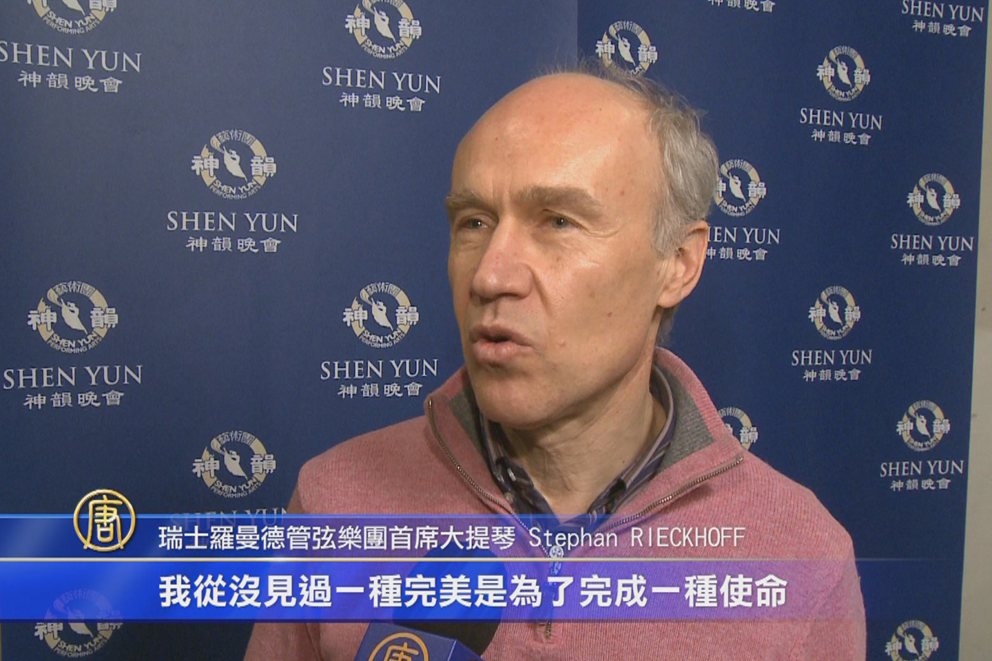 瑞士羅曼德管弦樂團首席大提琴Stephan RIECKHOFF:「當我看神韻時, 我看到音樂家和舞蹈演員們非常注重個人修為,尊重世上一切美的事務。這需要懂得尊重的含義,不僅僅是尊重他人,還是對自己,對一草一木,對宇宙中的萬事萬物的尊重。神韻所展現出的一切真是壯麗輝煌。」